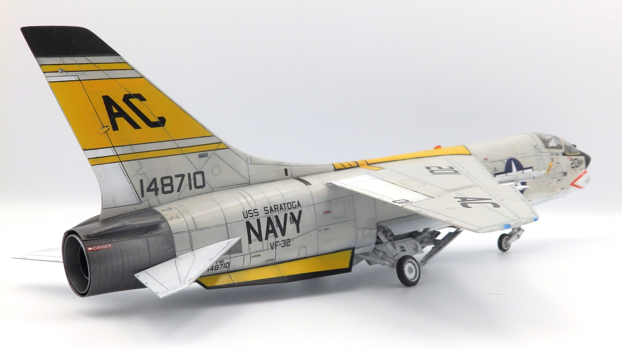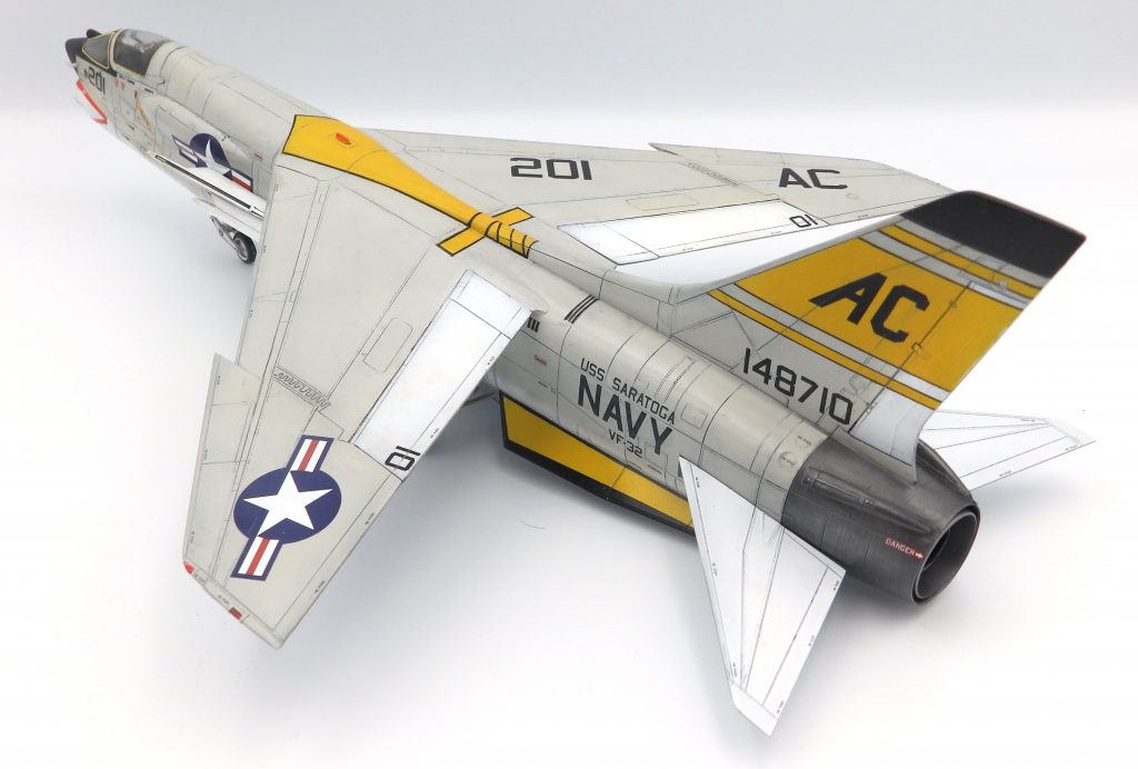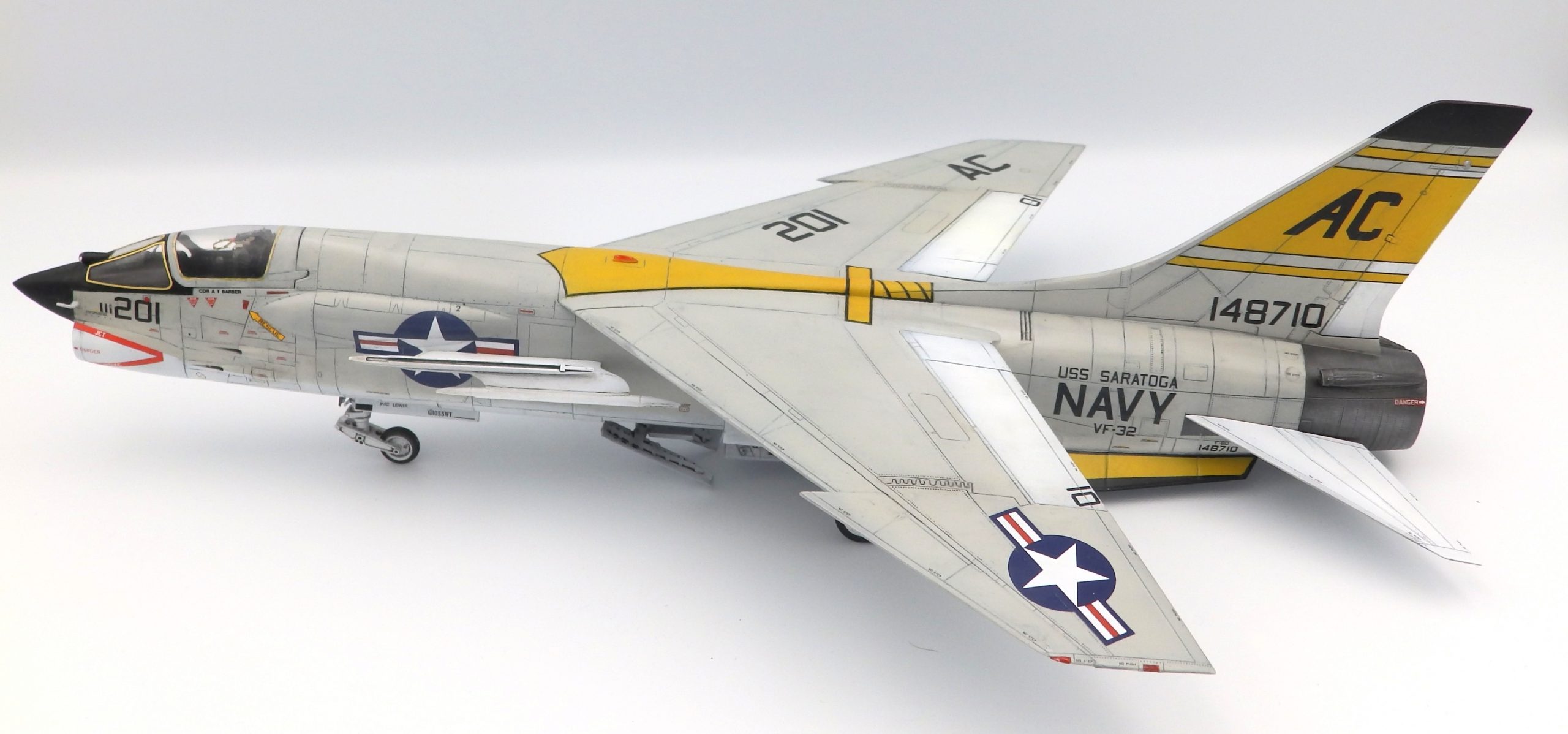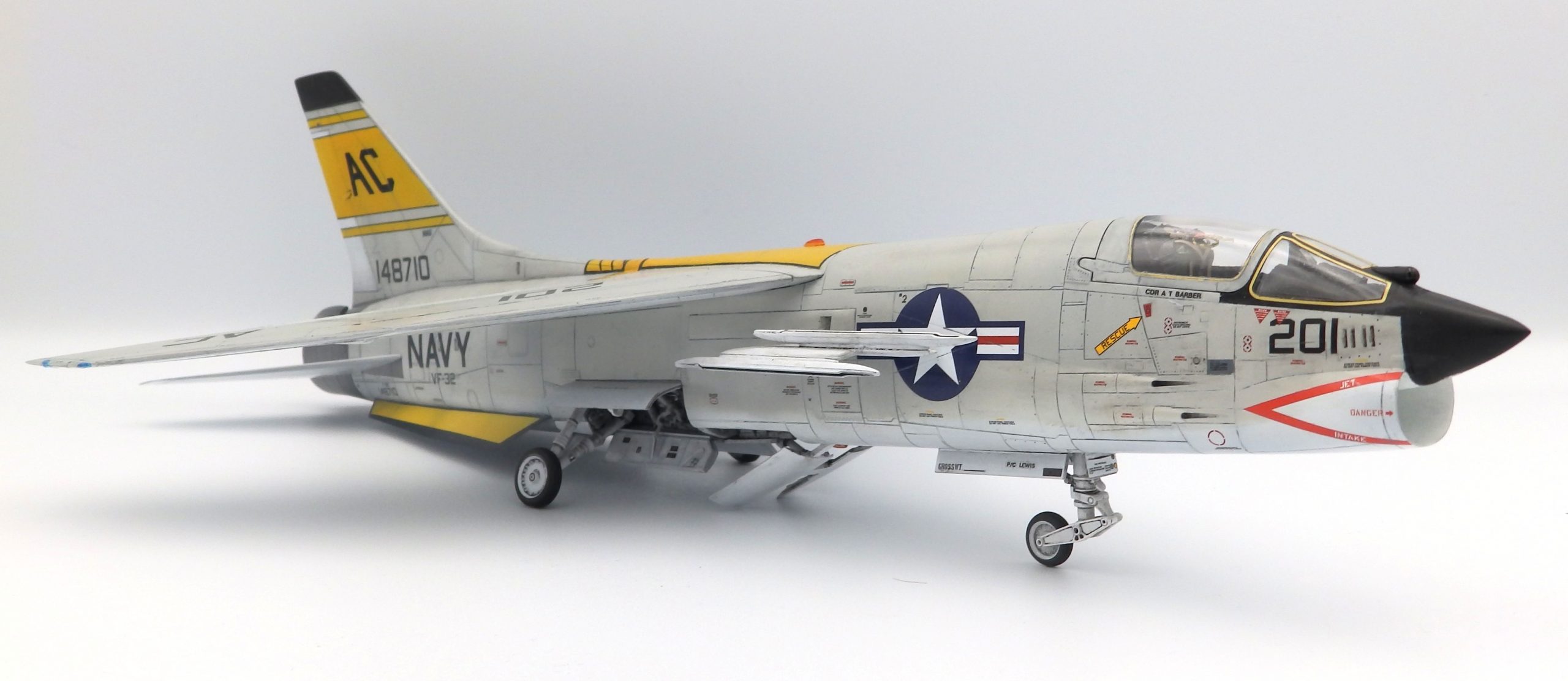 Just wanted to share this 1/48 Hasegawa F-8D that I converted using CAT4’s recently released conversion kit. This is a VF-32 jet circa 1965. The CAT4 nose cone needed some shape correction. With the help of a 3D print expert I replaced it with a more accurate nose cone. The decals for the yellow and black tail stripes and sword design on the spine also broke, so I instead painted them on using photocopy templates of the sheet, including the letters. Took me seven months to complete but this is my favorite build so far.