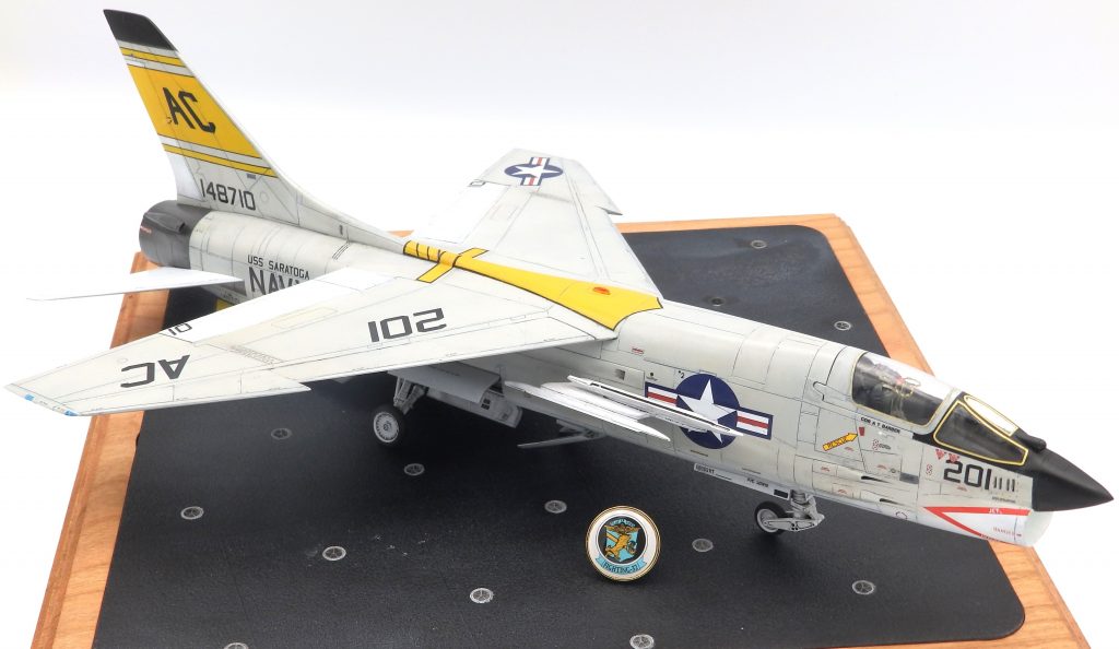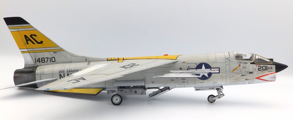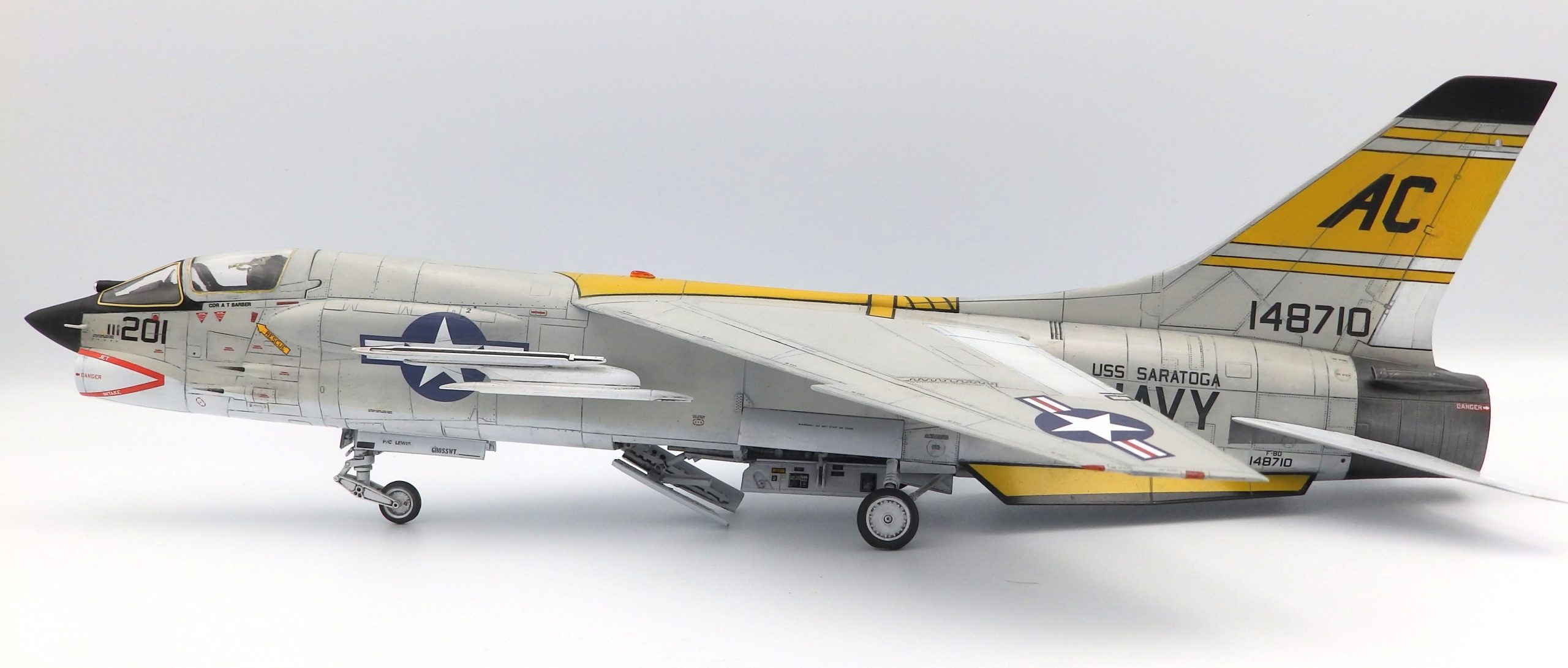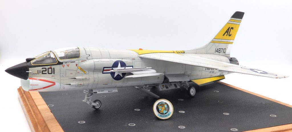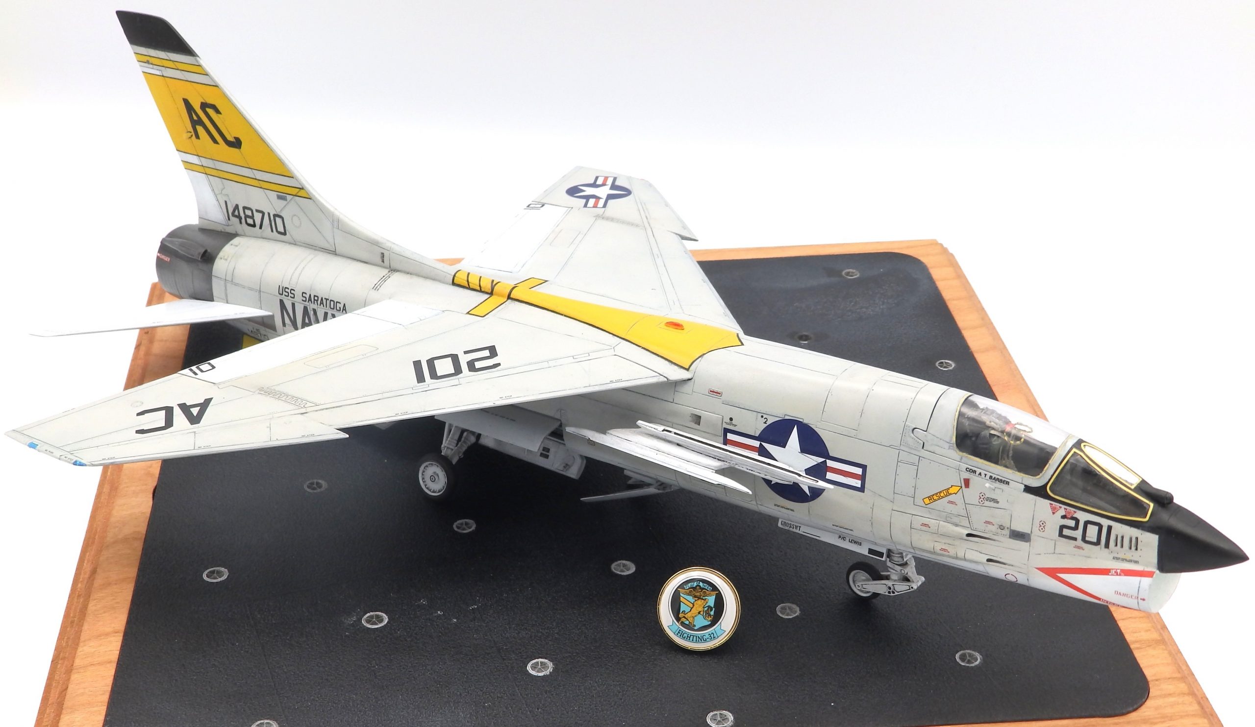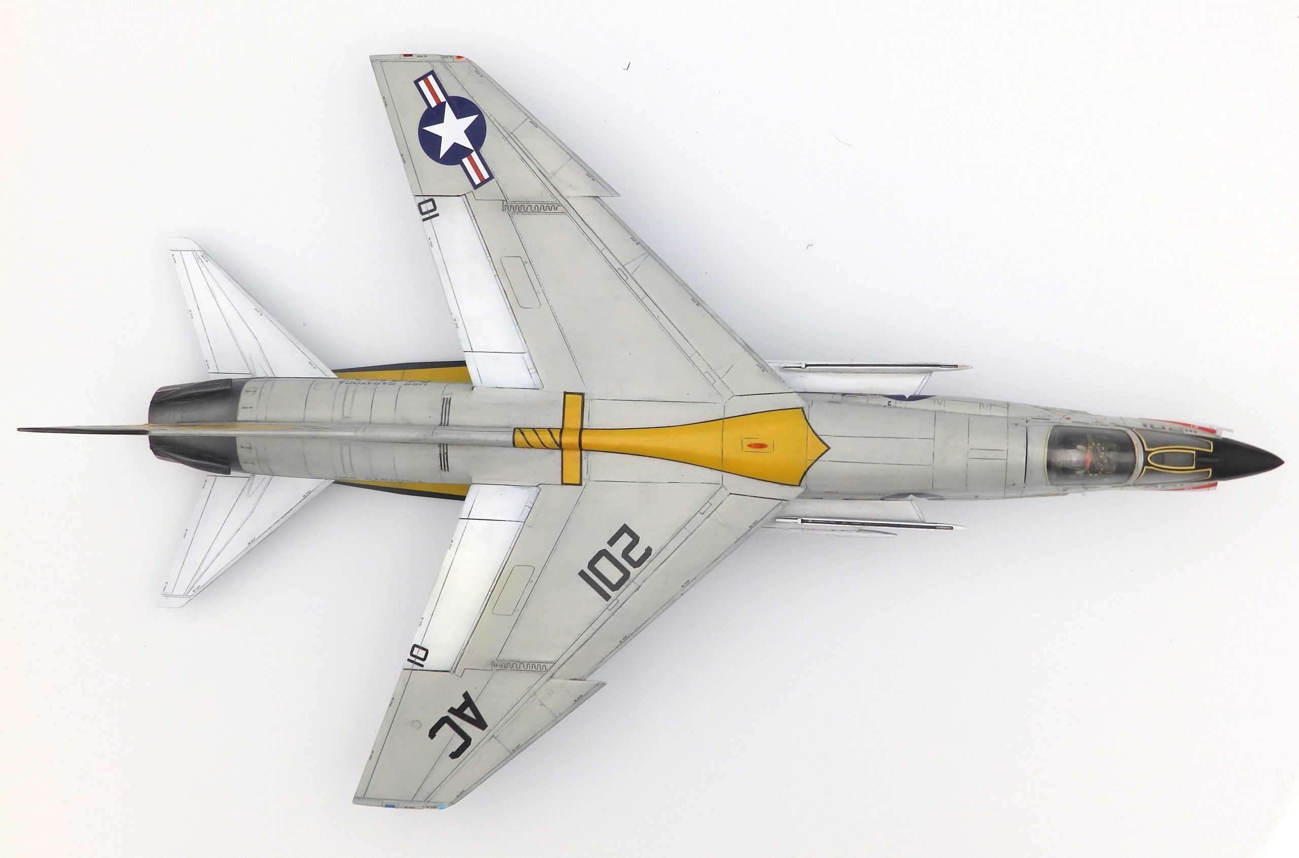 Just wanted to share this 1/48 Hasegawa F-8D that I converted using CAT4’s recently released conversion kit. This is a VF-32 jet circa 1965. The CAT4 nose cone needed some shape correction. With the help of a 3D print expert I replaced it with a more accurate nose cone. The decals for the yellow and black tail stripes and sword design on the spine also broke, so I instead painted them on using photocopy templates of the sheet, including the letters. Took me seven months to complete but this is my favorite build so far.