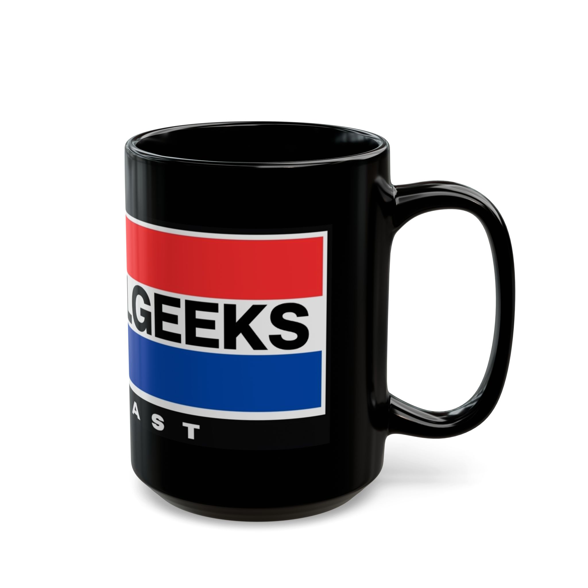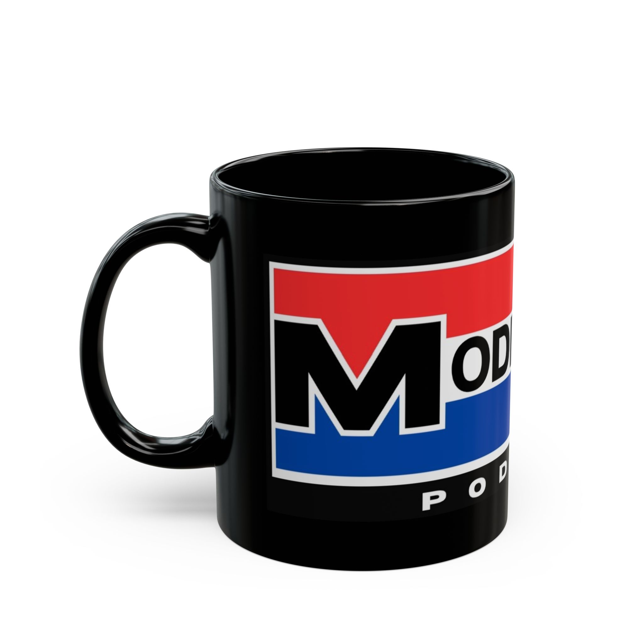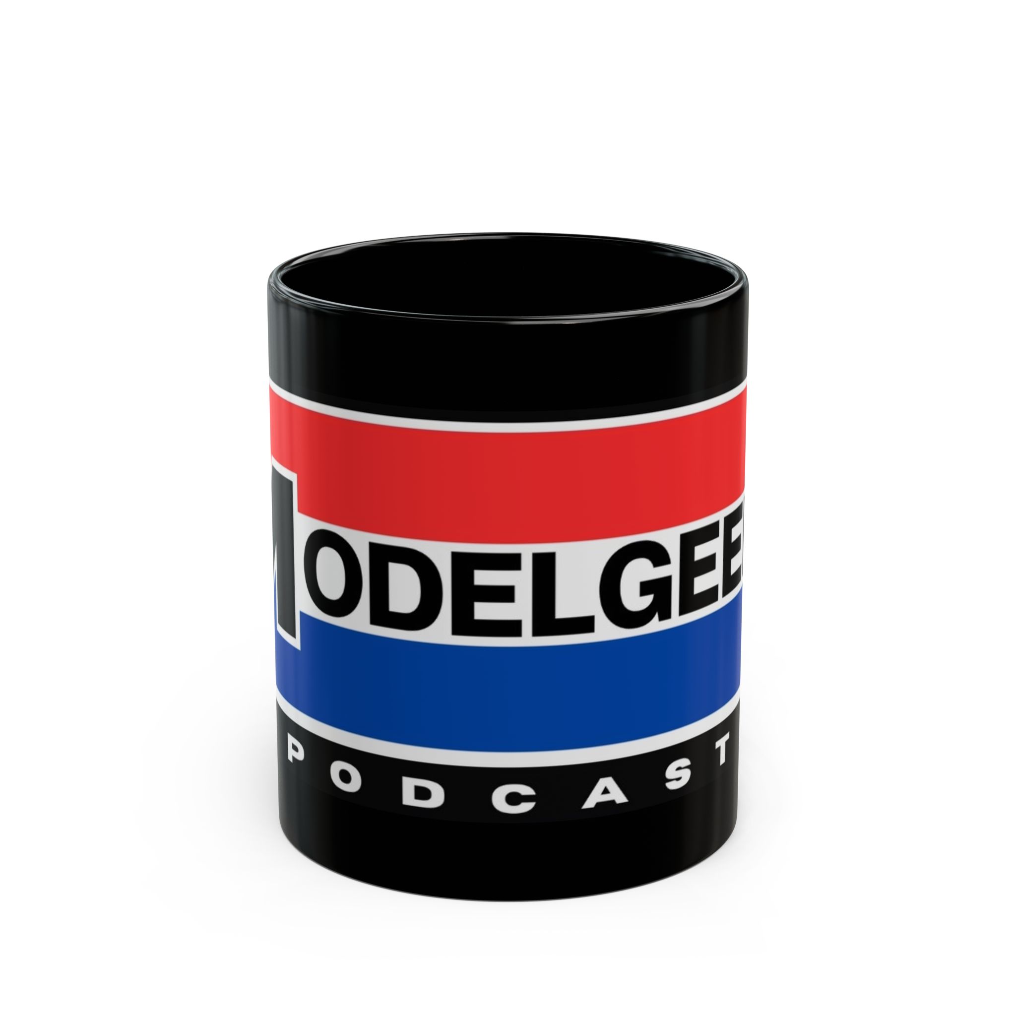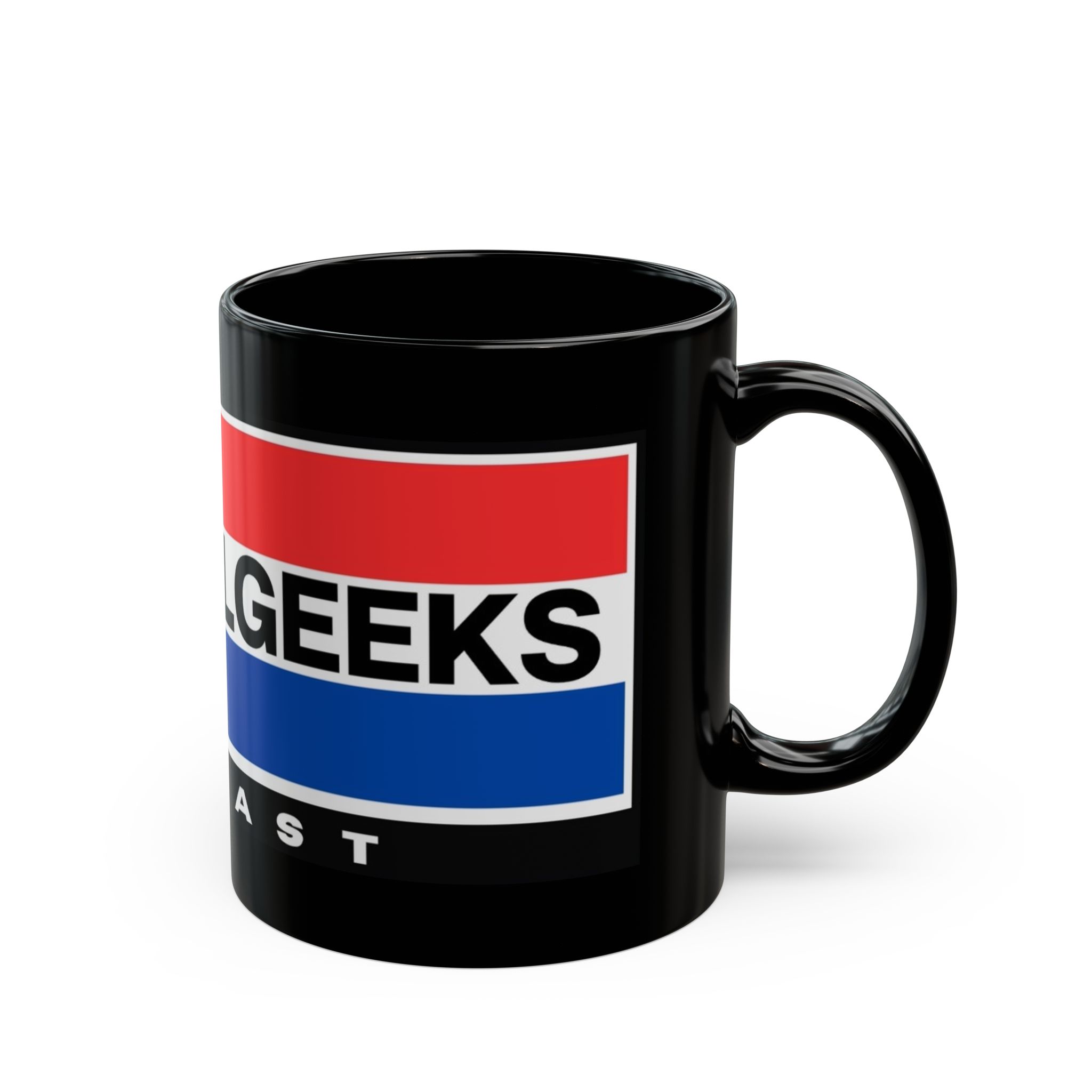 This glossy black ceramic mug brings bold, vintage-inspired color to your morning routine. Rich red and blue bands wrap the mug with crisp, high-definition printing that resists fading, while the deep black glaze makes the design pop. The comfortable C-shaped handle sits just right in hand as you sip coffee, tea, or the late-night brew that fuels recording sessions. Built for everyday use, it stands up to microwave reheats and dishwasher cycles without losing vibrancy. It’s tactile, sturdy, and made to live on desks, studio shelves, or beside the mic during long podcast edits—adding a little studio flair to daily rituals.
